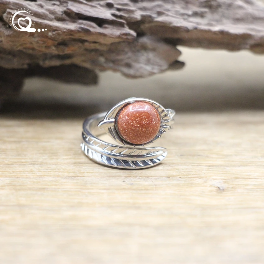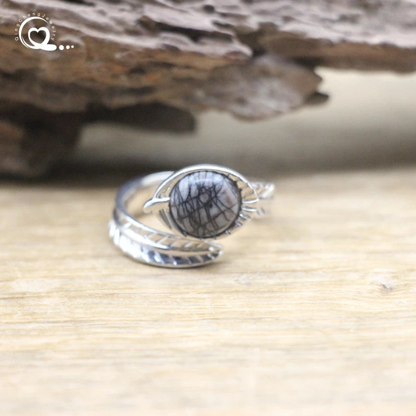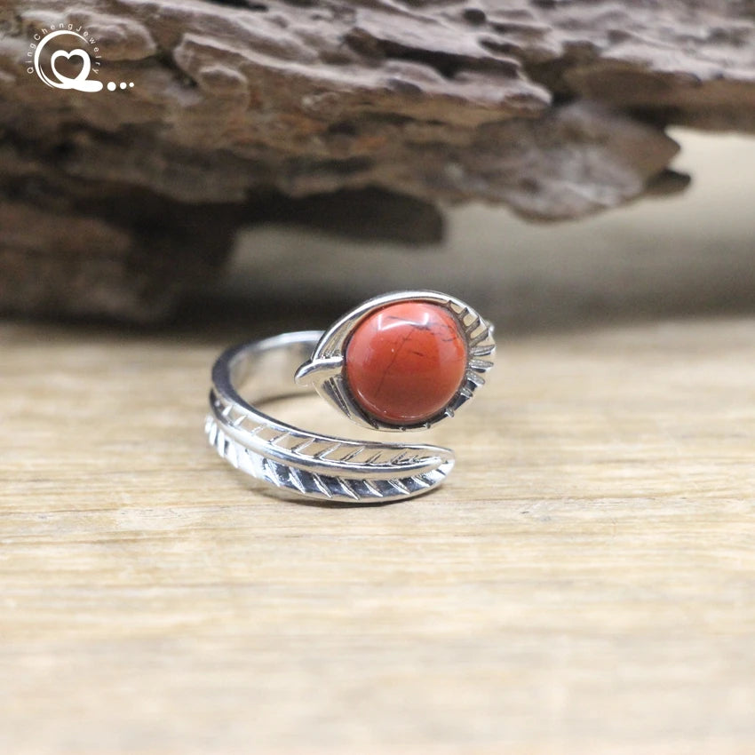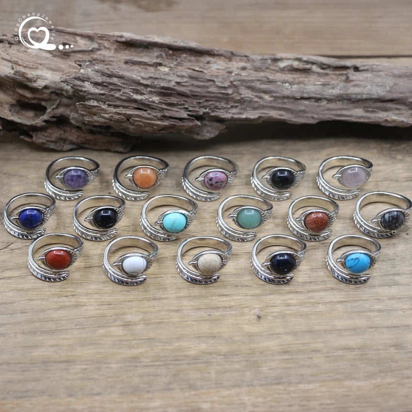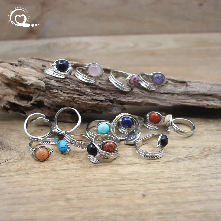 Carved Leaf Ntuaral Gems Stone Open Ring Reiki Healing Crystal Quartz Amethysts Lapis Round Adjustable Ring Women Jewelry,QC4063